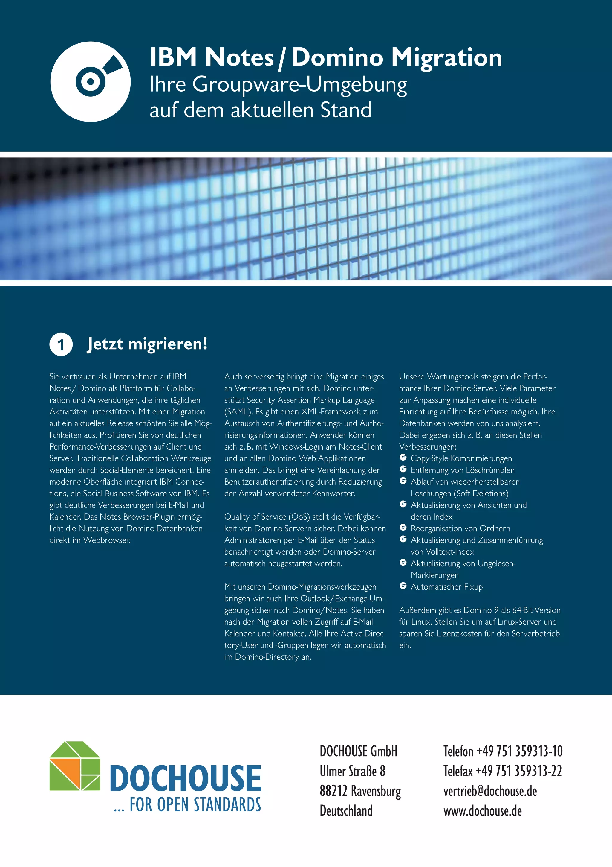 Die Dochouse GmbH bietet eine umfassende Migration Ihrer IBM Notes/Domino Groupware-Umgebung an, um die neuesten Funktionen und Verbesserungen zu nutzen. Die Migration umfasst eine Analyse der bestehenden Infrastruktur, individuelle Anpassungen und eine reibungslose Installation ohne Nutzerintervention. Nach der Migration stehen Ihnen neue Funktionen und effektive Wartungstools zur Verfügung, um die Performance und Verfügbarkeit Ihrer Domino-Server zu optimieren.