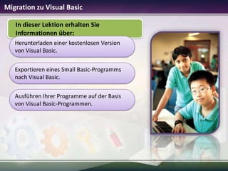 In dieser Lektion lernen Sie, wie Sie Small Basic-Programme nach Visual Basic exportieren und die Entwicklungsumgebung von Visual Basic herunterladen und installieren. Die Installation der kostenlosen Visual Basic Express Edition dauert etwa 10 bis 15 Minuten, und der Migrationsassistent erleichtert den Export Ihrer Programme. Visual Basic ist eine leistungsfähige Programmierumgebung, die Ihre Programmierfähigkeiten erweitern kann.