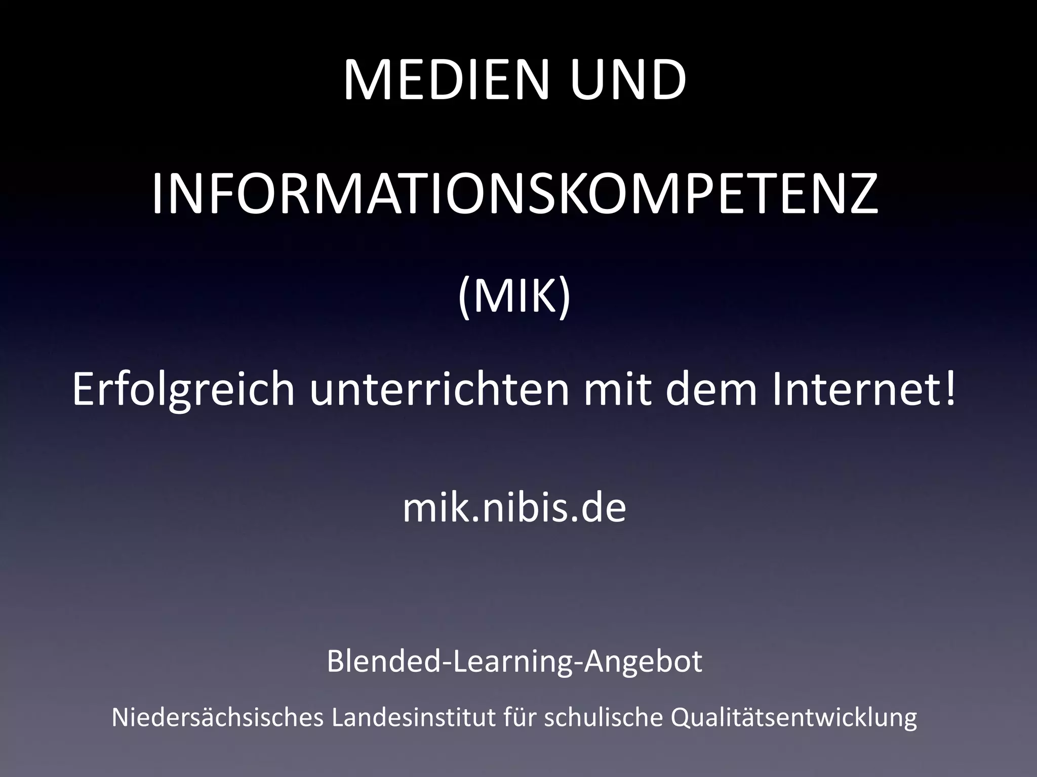 Das Dokument beschreibt ein Blended-Learning-Angebot des Niedersächsischen Landesinstituts für schulische Qualitätsentwicklung zur Medien- und Informationskompetenz (MIK) mit vier Modulen, die sich auf den sinnvollen und sicheren Einsatz digitaler Medien konzentrieren. Der Kurs richtet sich an Lehrkräfte und Medienpädagogen und fördert individuelles sowie kooperatives Lernen über die Nutzung von Web 2.0-Tools. Weitere Informationen sind auf der angegebenen Webseite verfügbar.