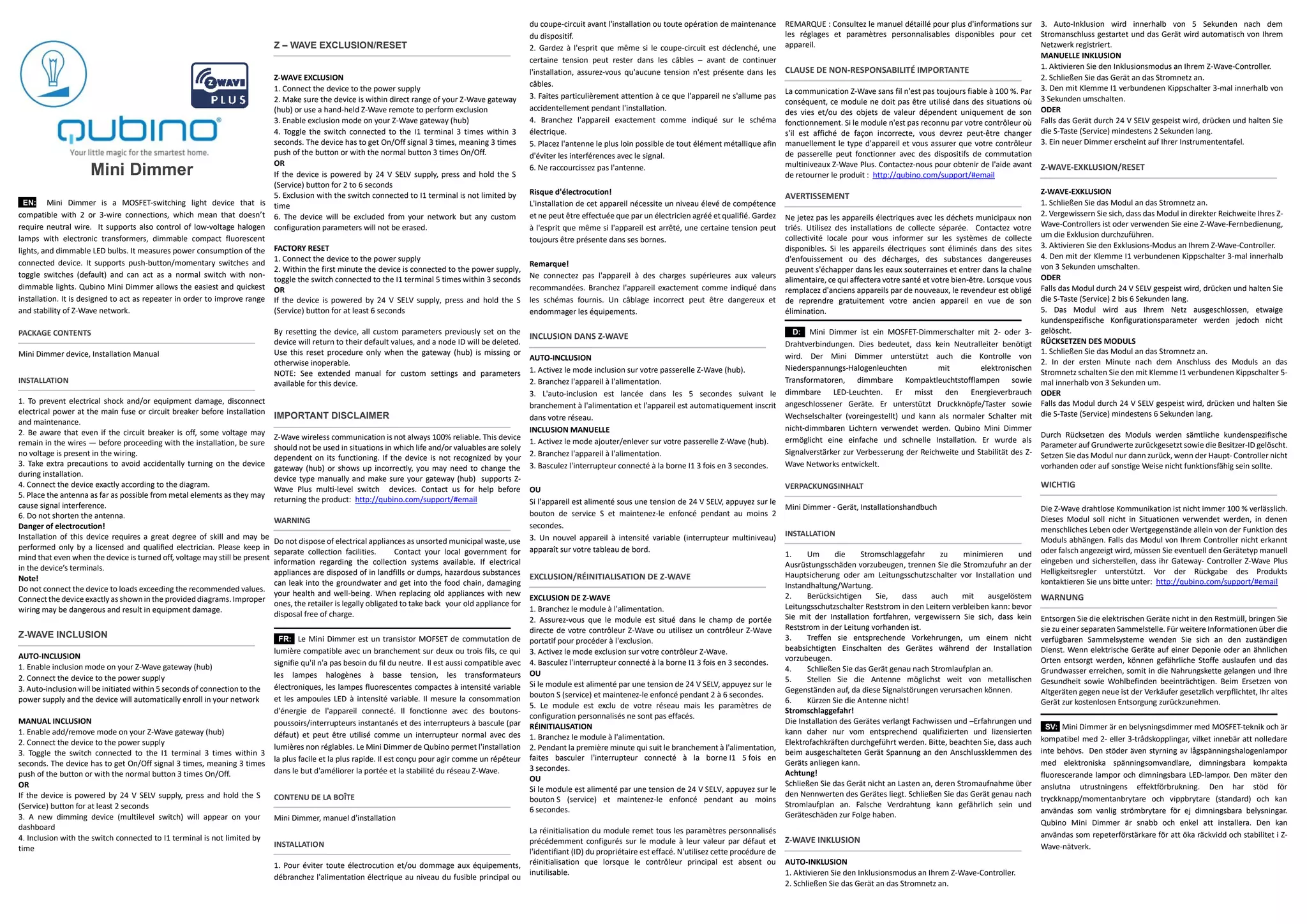 Der Qubino Mini Dimmer ist ein MOSFET-Dimmerschalter, der mit 2- oder 3-Drahtanschlüssen kompatibel ist und keinen Neutralleiter benötigt. Er kann eine Vielzahl von Beleuchtungstypen steuern und die Energieverb consumption messen, bietet einfache Installation und kann als Repeater in einem Z-Wave-Netzwerk fungieren. Die korrekte Installation erfordert qualifizierte Elektriker und es lassen sich spezifische Sicherheits- und Einschlussverfahren umsetzen.