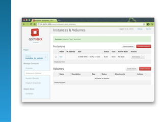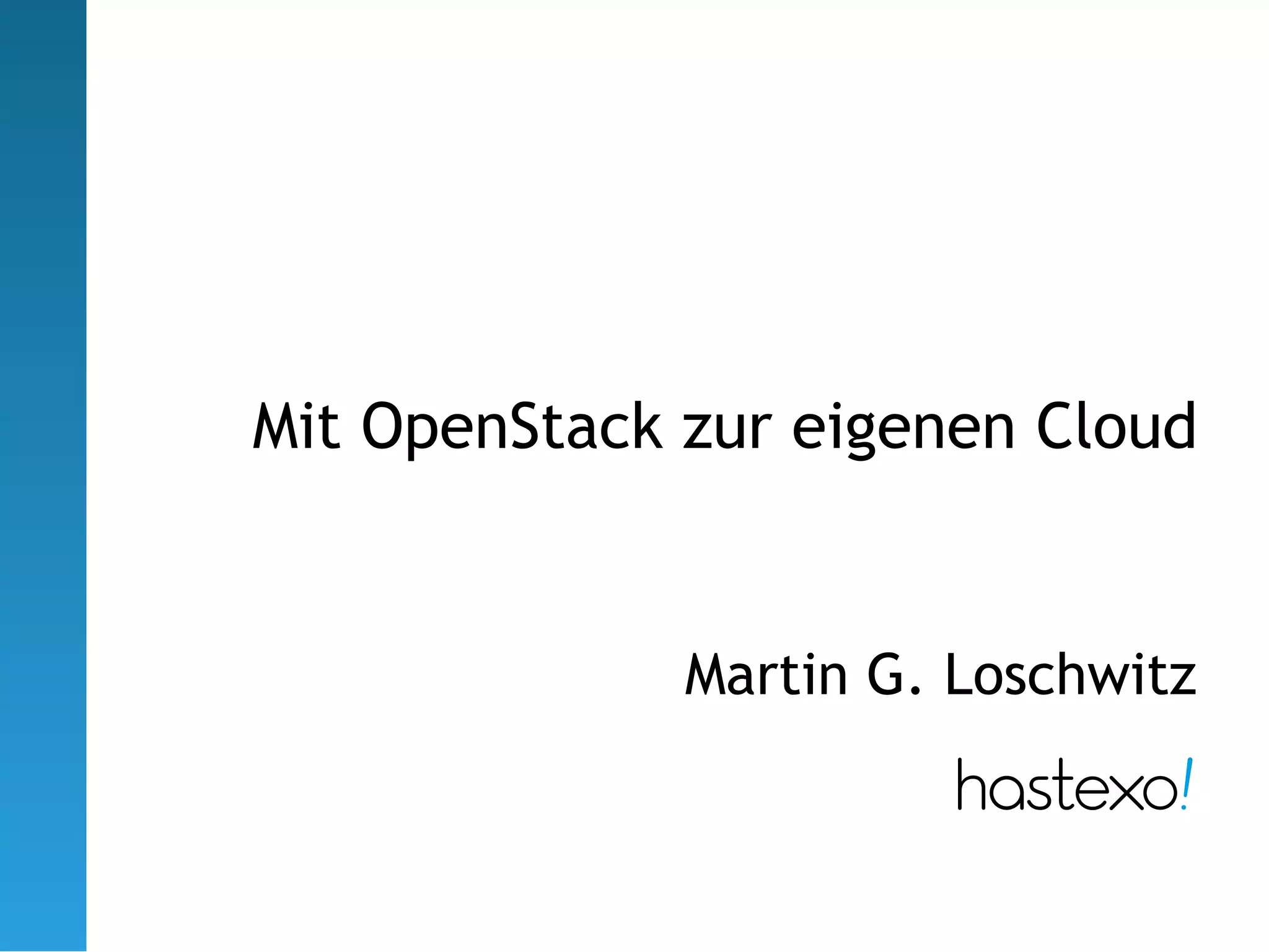 Das Dokument erörtert den Einsatz von OpenStack zur Schaffung einer eigenen Cloud, wobei verschiedene Modelle wie IaaS, SaaS und PaaS thematisiert werden. Es beschreibt die Notwendigkeit von Automatisierung und Hochverfügbarkeit in der Cloud-Umgebung sowie die sechs Hauptkomponenten von OpenStack, darunter das Dashboard, RabbitMQ und das Compute-Modul. Der Text beinhaltet auch Hinweise auf Ressourcen und Kontaktinformationen des Autors.