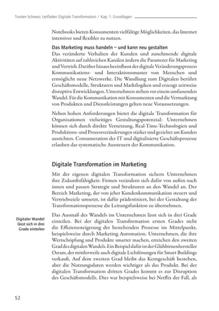 Das Dokument behandelt die digitale Transformation in Unternehmen, insbesondere im Marketing, und beschreibt, wie digitale Technologien das Kundenverhalten und die Kommunikationskanäle verändern. Es skizziert die verschiedenen Grade der digitalen Transformation, beginnend mit Effizienzsteigerung bis hin zur disruptiven Veränderung von Geschäftsmodellen, und betont die Bedeutung einer kundenorientierten Strategie. Zudem wird das Digital Media Maturity Model (DM3) vorgestellt, um die digitale Reife und Potenziale von Unternehmen zu analysieren und zu optimieren.