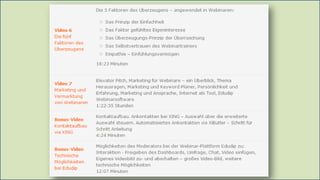 Das Dokument beschreibt die fünf Kriterien für die Erstellung professioneller Webinare, einschließlich der Bedeutung von Expertise, Struktur, Interaktion und Moderation. Es bietet zudem wertvolle Tipps zur Gestaltung, Methodik und zur Begeisterung der Teilnehmer und schließt mit der Werbung für einen 9-teiligen Videokurs zu Webinar-Coaching ab. Informationen über technische Probleme und deren Behebung werden ebenfalls bereitgestellt.