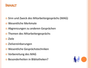 Das Dokument beschreibt die Anforderungen und Besonderheiten von Mitarbeitergesprächen, insbesondere in Bibliotheken. Es betont den Sinn des Gespräches zur Förderung der Eigenverantwortlichkeit, der Zufriedenheit und des Vertrauens zwischen Mitarbeitern und Führungskräften sowie die Wichtigkeit von Zielvereinbarungen und effektiven Gesprächstechniken. Besonderheiten in Bibliotheken umfassen starre Hierarchien, begrenzte Gestaltungsmöglichkeiten und geringe Aufstiegschancen.