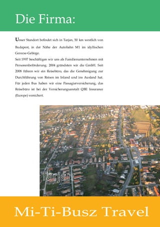 Die Miskovics-Busz GmbH ist ein Familienunternehmen in Tarján, Ungarn, das seit 1997 Personenbeförderungen und Reisen im In- und Ausland anbietet. Neben verschiedenen Dienstleistungen wie Stadtrundfahrten, Übersetzungen und kulturellen Programmen organisiert das Reisebüro auch Naturtourismus und maßgeschneiderte Reisen. Das Unternehmen legt großen Wert auf Gästezufriedenheit, Qualität, Pünktlichkeit und Flexibilität.