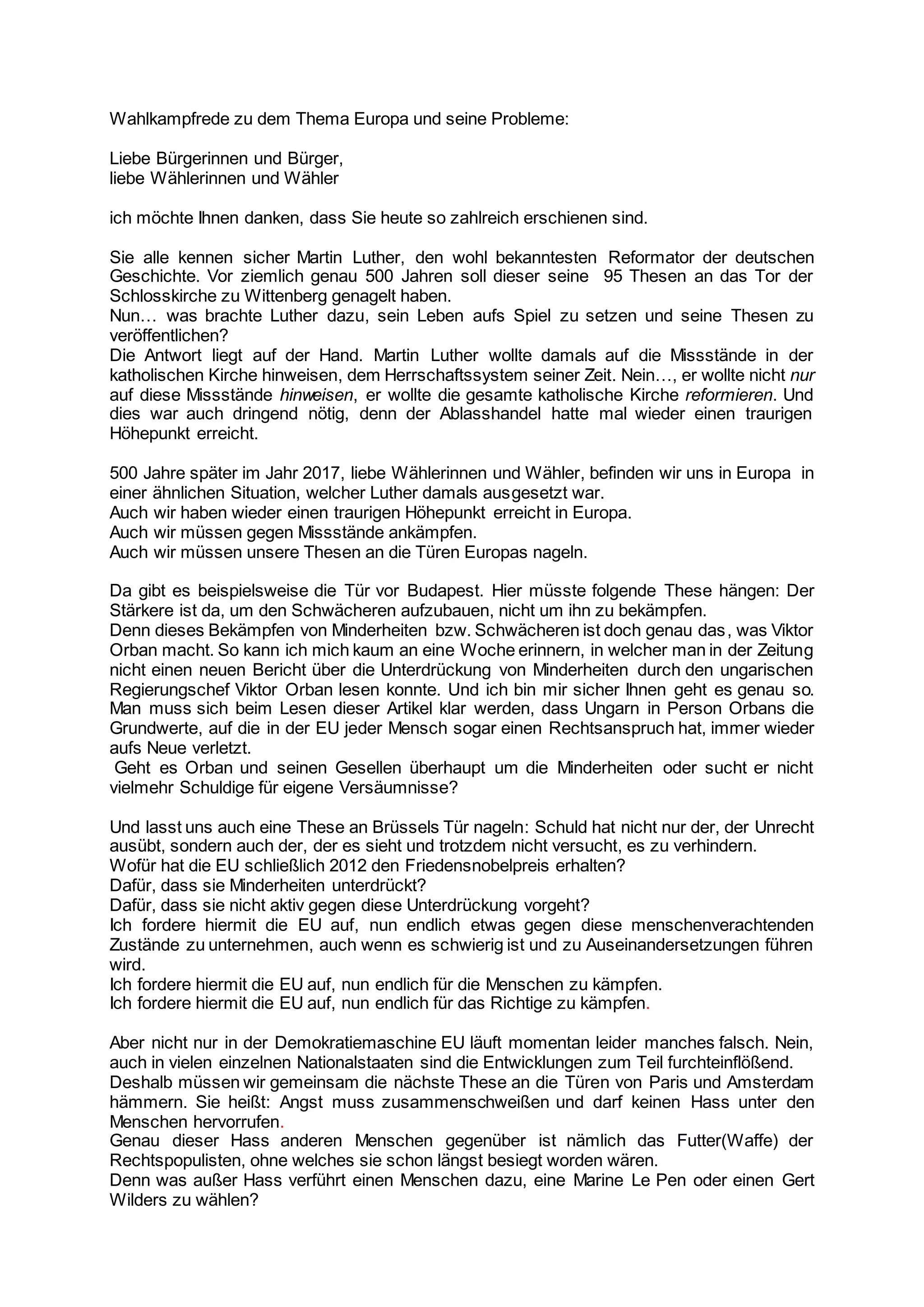 In seiner Wahlkampfrede spricht der Redner über die sozialen und politischen Missstände in Europa, vergleichend mit der Zeit Martin Luthers. Er fordert die Bürger auf, aktiv an Wahlen teilzunehmen und sich für demokratische Werte sowie gegen die Unterdrückung von Minderheiten einzusetzen. Zudem betont er die Notwendigkeit sozialer Gerechtigkeit und gemeinsamer Anstrengungen, um die Probleme in der europäischen Gesellschaft zu bekämpfen.
