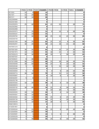Das Dokument enthält eine umfassende Liste von Prüfziffern und deren zugehörigen Ergebnissen aus mehreren Prüfungen und Aufgaben über verschiedene Jahre. Jede Zeile repräsentiert eine spezifische Prüfungsnummer gefolgt von den entsprechenden Noten, die in verschiedenen Kategorien erzielt wurden. Die Daten scheinen zur Analyse oder Überprüfung der Leistung in einem akademischen Kontext verwendet zu werden.