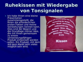 Das Dokument beschreibt die Entwicklung und Herstellung von Ruhekissen, die Tonsignale wie den Herzschlag der Mutter ausgeben, um Babys beim Einschlafen zu helfen. Es wird eine breite Produktpalette angestrebt, die nicht nur auf Babys, sondern auch auf Erwachsene abzielt und verschiedene Anwendungen wie Entspannung, Unterhaltung und Therapie umfasst. Zudem wird erläutert, wie Märchen die Fantasie und Entwicklung von Kindern fördern können.