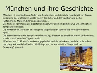 München ist die bayerische Hauptstadt und bekannt für ihre Kultur, Traditionen und historische Bedeutung, insbesondere während des Zweiten Weltkriegs. Die Stadt zieht Touristen mit wichtigen Museen, dem Englischen Garten, der Frauenkirche und dem Marienplatz an und ist berühmt für das Oktoberfest, das jährlich stattfindet. Das kontinentale Klima zeichnet sich durch starke Temperaturschwankungen und lange Winter mit viel Schnee aus.