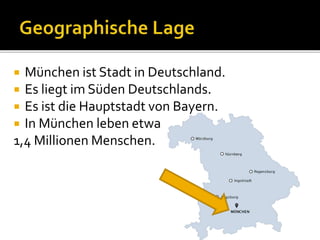 München ist eine Stadt im Süden Deutschlands und die Hauptstadt von Bayern mit etwa 1,4 Millionen Einwohnern. Jährlich besuchen fast 6 Millionen Touristen die Stadt, die bekannt für das Oktoberfest, das größte Volksfest der Welt, ist. Zu den Sehenswürdigkeiten gehören das Rathaus mit dem Glockenspiel und eines der modernsten Stadien der Welt sowie die Profi-Fußballvereine FC Bayern München und TSV 1860 München.