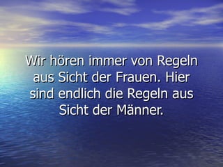 Das Dokument listet humorvolle 'Regeln' aus der Sicht von Männern, die verschiedene Aspekte des Verhaltens und der Kommunikation in Beziehungen thematisieren. Die Regeln betonen häufig die Unterschiede zwischen männlicher und weiblicher Wahrnehmung und Kommunikation sowie die Daseinsberechtigung männlicher Vorlieben. Ziel ist es, sowohl Männer zum Schmunzeln zu bringen als auch Frauen einige grundlegende Verhaltensweisen näher zu bringen.
