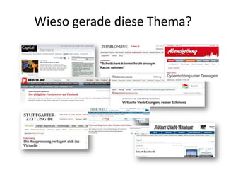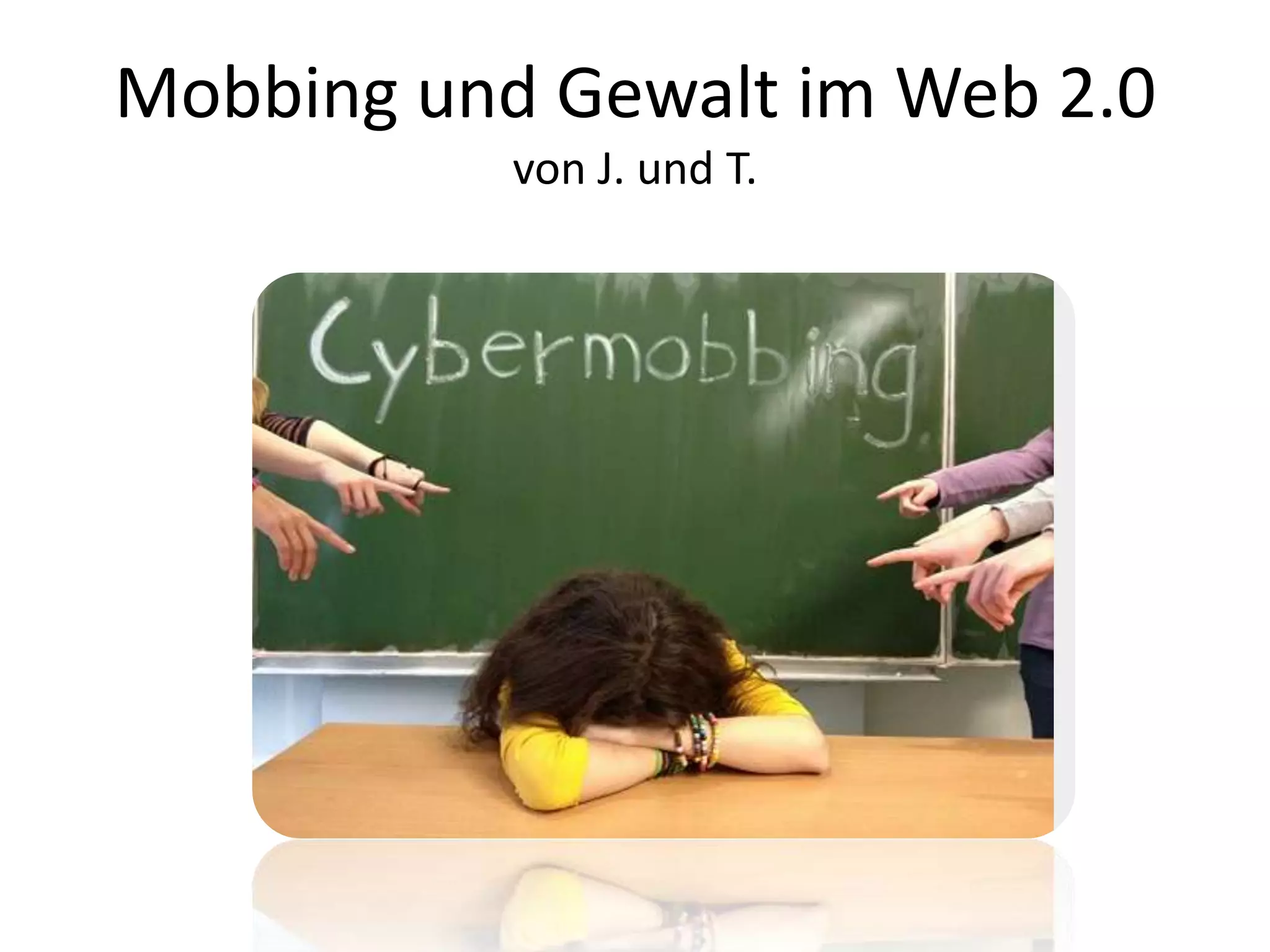 Das Dokument behandelt Mobbing und Cybermobbing im Web 2.0, definiert diese Begriffe und beschreibt die wiederholten Schikanen und seelischen Verletzungen, die dabei auftreten. Es führt bekannte Fälle von Cybermobbing an, die tragische Folgen hatten, sowie das Phänomen des Shitstorms, bei dem viele Nutzer negative Kampagnen gegen Einzelpersonen oder Unternehmen starten. Ein bekanntes Beispiel ist der Konflikt zwischen Greenpeace und Nestlé im Jahr 2010, der als erster großer Shitstorm gilt.