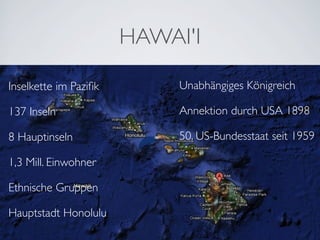 Der Erfahrungsbericht beschreibt eine vierwöchige Reise durch Hawai'i, die digitalen Medien und soziale Netzwerke nutzt, um sich mit der lokalen Kultur und Bevölkerung zu verbinden. Der Autor diskutiert Strategien für den Aufbau von Beziehungen und Kommunikation über Plattformen wie Twitter, Facebook und Blogs. Zudem wird auf die Verfügbarkeit von WLAN und die Nutzung von Technologien zur Erleichterung der Kommunikation während der Reise eingegangen.
