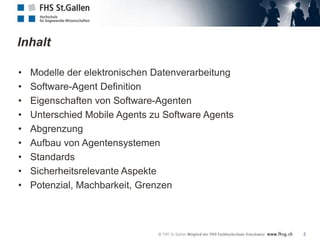 Das Dokument beschreibt die Merkmale und Funktionsweisen von Software-Agenten, insbesondere von mobilen Agenten, die autonom agieren und ihren Ausführungsort selbstständig wechseln können. Es werden verschiedene Anwendungsfelder, wie elektronische Commerce und Informationsbeschaffung, ebenso wie Sicherheitsaspekte und technische Herausforderungen diskutiert. Außerdem wird auf die Grenzen der aktuellen Technologien und die Akzeptanzprobleme der Nutzer hingewiesen.