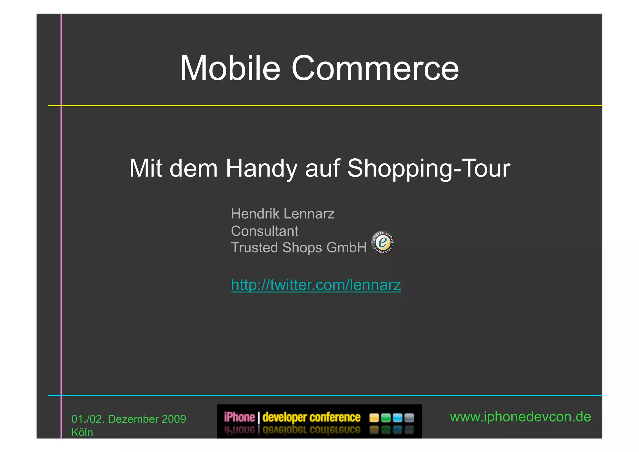 Das Dokument behandelt die Relevanz und Möglichkeiten des Mobile Commerce (m-Commerce) im Jahr 2009, insbesondere in Bezug auf steigende Nutzerzahlen und technologische Herausforderungen. Es werden Beispiele mobiler Einkaufslösungen sowie Empfehlungen für eine erfolgreiche Umsetzung gegeben. Der Ausblick zeigt, dass Smartphones zunehmend traditionelle Computer ersetzen und als Bindeglied zwischen Online- und Offline-Diensten fungieren werden.