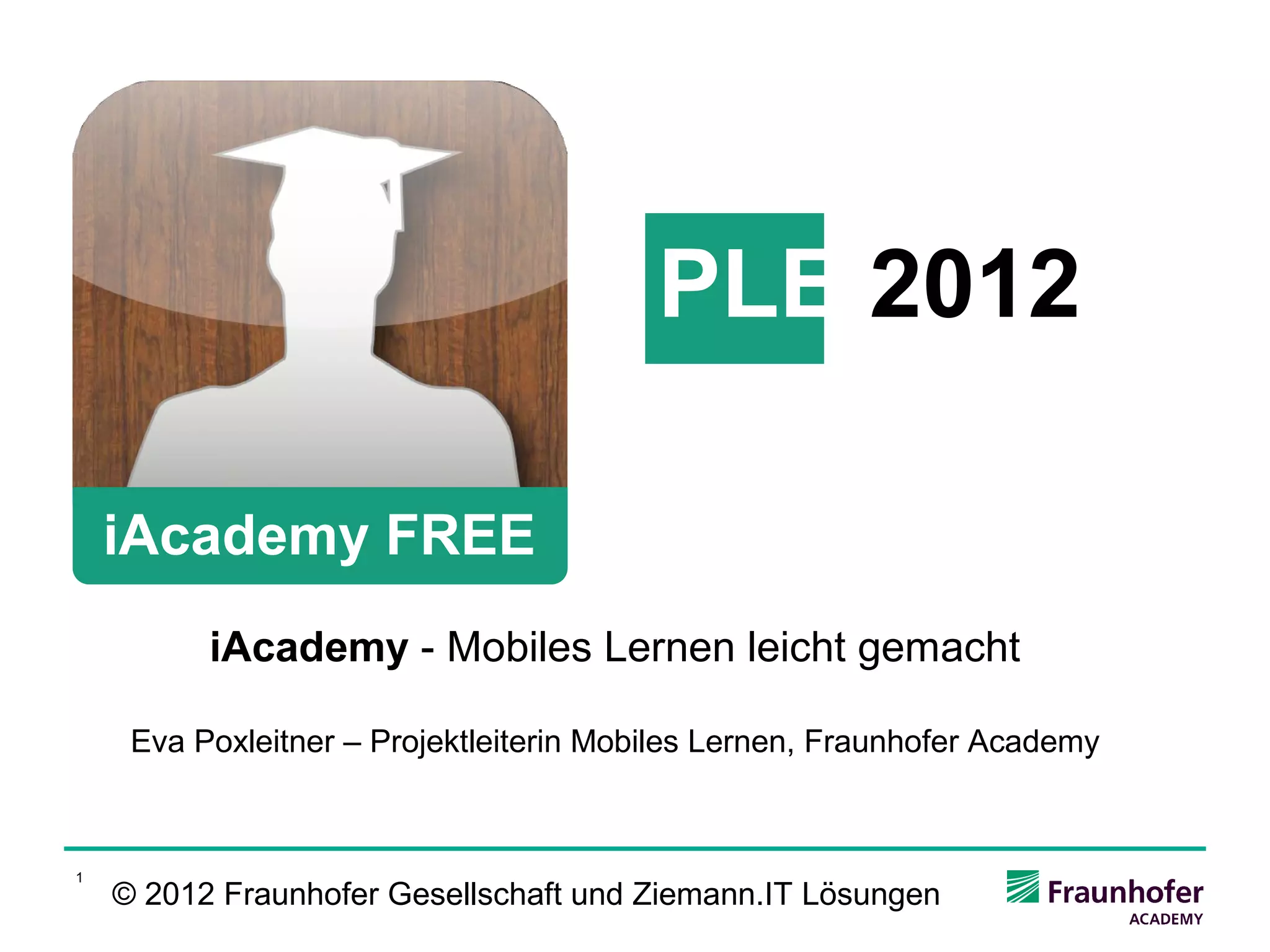 Das Dokument beschreibt die Fraunhofer iacademy, die mobile Lernlösungen für Fach- und Führungskräfte bietet, um dem Fachkräftemangel in Deutschland entgegenzuwirken. Es umfasst Vorteile des mobilen Lernens, darunter Flexibilität, intuitive Nutzung und situatives Lernen sowie die Entwicklung einer iPad-App zur Bereitstellung von Lerninhalten. Die iacademy-Plattform ermöglicht offline Lernen und die Erstellung von Lerninhalten durch Benutzer, und beinhaltet ein Web-Portal zur Verwaltung von Kursdateien.