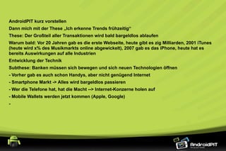 Das Dokument thematisiert die zunehmende Bedeutung bargeldloser Transaktionen und prognostiziert, dass der Großteil aller Transaktionen bald ohne Bargeld ablaufen wird. Basierend auf technologischen Entwicklungen wie dem Aufkommen des Internets, iTunes und Smartphones argumentiert der Autor, dass Banken sich neuen Technologien anpassen müssen, da mobile Wallets von Unternehmen wie Apple und Google auf dem Vormarsch sind. Die zentrale Rolle der Apple-ID für digitale Zahlungen wird hervorgehoben, da diese den Kauf digitaler Produkte und Dienstleistungen erleichtert.