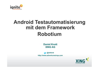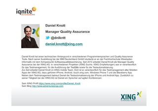 Daniel Knott, Manager für Qualitätssicherung bei Xing AG, erläutert in seiner Präsentation über Testautomatisierung mit Robotium, einem Open-Source-Framework für Android. Er beleuchtet die Vorteile wie die Unterstützung echter Hardware und die starke Community, sowie die Nachteile wie langsame Ausführungszeiten und keinen Multi-Device-Support. Zudem gibt er Einblicke in Best Practices und Techniken zur effektiven Testautomatisierung.
