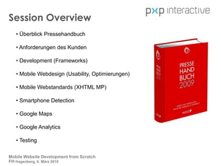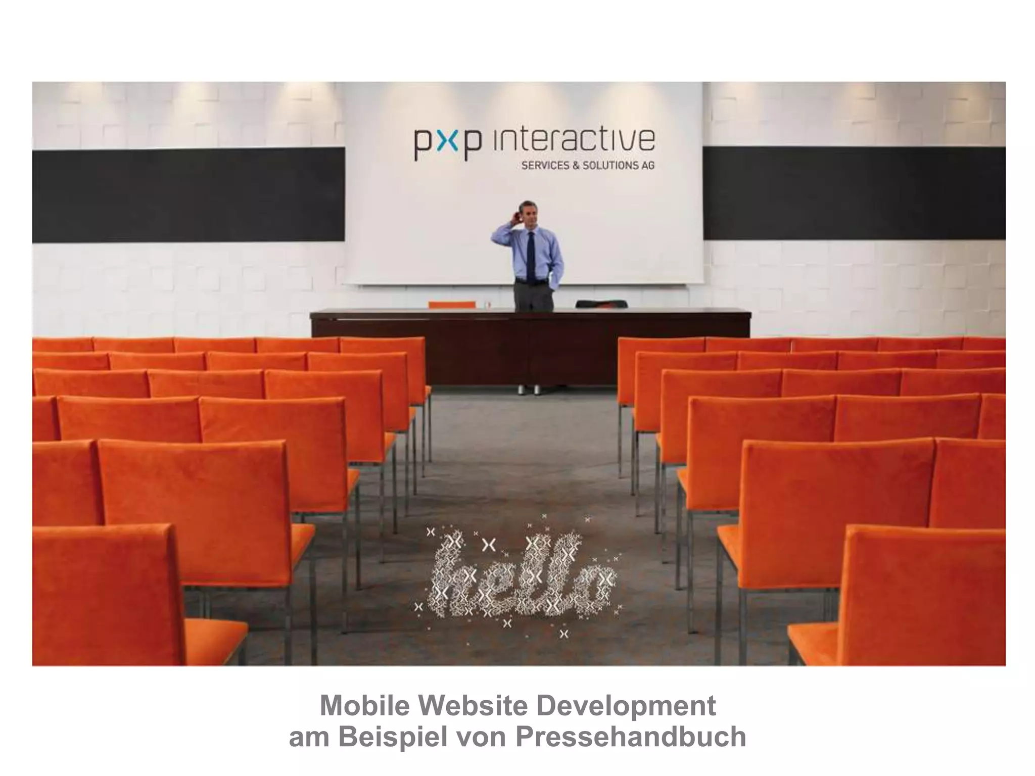 Das Dokument behandelt die Entwicklung von mobilen Websites am Beispiel des Pressehandbuchs, das seit 2006 eine umfassende Datenbank für Medienkontakte in Österreich bereitstellt und ab März 2010 auch in einer mobilen Version verfügbar ist. Es werden Anforderungen an die mobile Website, Designprinzipien, technische Standards sowie Testing-Methoden erläutert, um eine nutzerfreundliche und effiziente mobile Anwendung zu gewährleisten. Zudem werden Tools und Technologien wie Google Analytics und MVC-Pattern erwähnt, die zur Optimierung und Implementierung genutzt werden können.