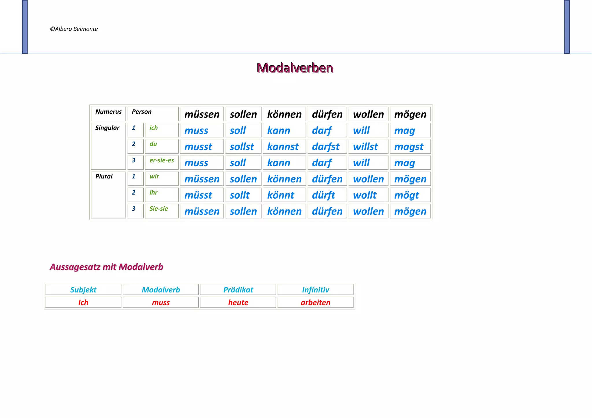 Das Dokument behandelt die Verwendung von Modalverben in verschiedenen Personen und Numeri im Deutschen. Es bietet eine Übersicht zu den konjugierten Formen von Modalverben wie 'müssen', 'sollen', 'können', 'dürfen', 'wollen' und 'mögen'. Zudem wird ein Beispiel für einen Aussagesatz mit einem Modalverb gegeben.