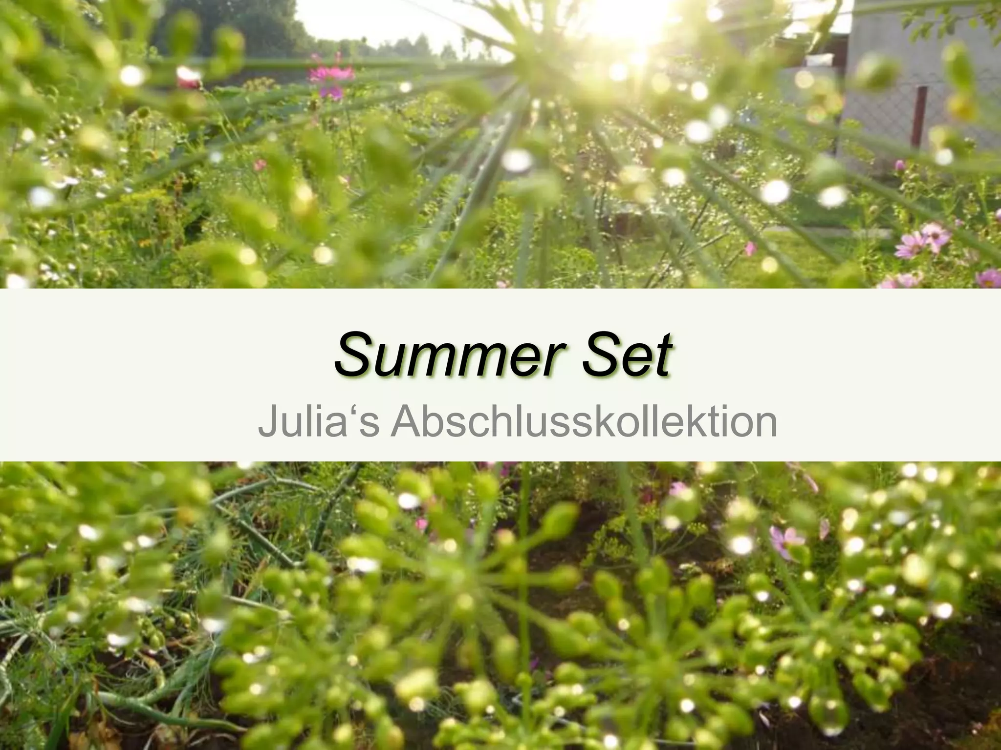 Das Dokument listet die Outfits von Julias Abschlusskollektion 'Summer Set' auf, die aus zehn verschiedenen Looks besteht. Jedes Outfit hat einen spezifischen Namen, darunter 'Kirschblüte', 'Feuer und Flamme' und 'Business'. Die Kollektion zeigt eine Vielfalt an Themen und Stilen.