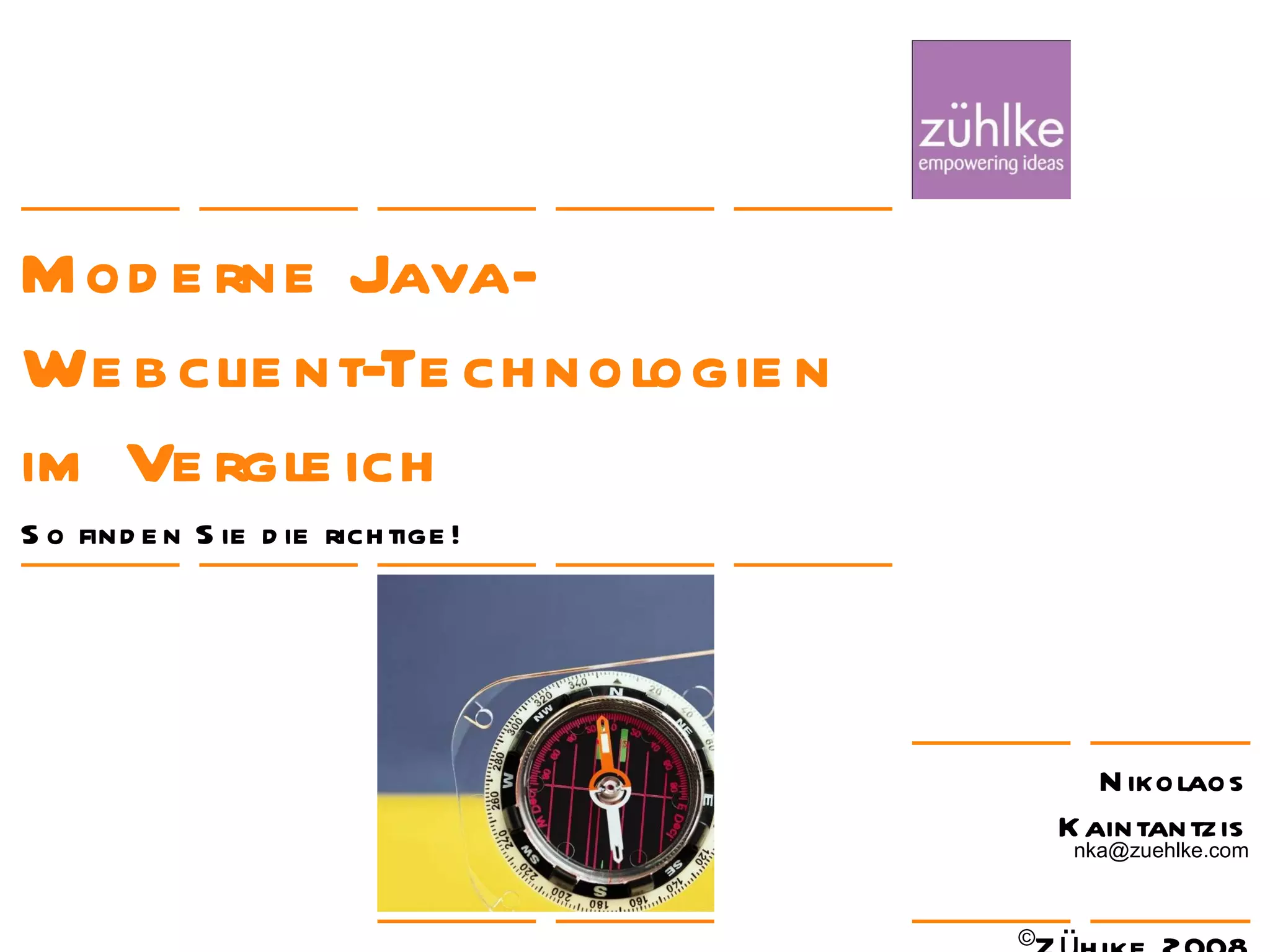 Die Präsentation bietet einen Überblick über moderne Java-Webclient-Technologien und stellt einen Kriterienkatalog zur Evaluierung verschiedener Technologien bereit. Es werden die Vor- und Nachteile der einzelnen Technologien beleuchtet, um Entscheidungsträgern bei der Auswahl geeigneter Lösungen in einem dynamischen Umfeld zu helfen. Wichtige Erfolgsfaktoren sind die Berücksichtigung der Nutzerbedürfnisse, eine angemessene Technologieauswahl und die Überprüfung der getroffenen Entscheidungen durch Prototypen.