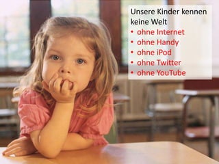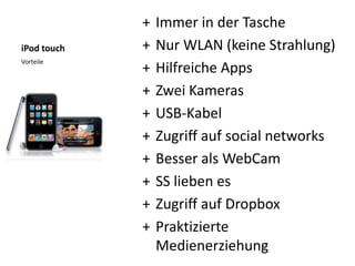 Das Dokument behandelt die Veränderungen im Lernverhalten durch mobile Technologien wie Smartphones und Tablets, und wie diese Werkzeuge die traditionelle Unterrichtsmethodik beeinflussen. Es werden die Vorteile und Herausforderungen des Einsatzes von mobilen Geräten und Plattformen wie Moodle und Dropbox im Bildungsbereich diskutiert, sowie die Bedeutung von QR-Codes für interaktive Lernmöglichkeiten hervorgehoben. Darüber hinaus wird die mediale Erziehung und die Notwendigkeit der Integration neuer Technologien in die Schule beleuchtet.