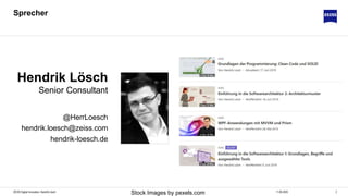 Das Dokument behandelt modulare Architekturen in der Softwareentwicklung mit .NET, präsentiert von Hendrik Lösch, Senior Consultant bei Zeiss Digital Innovation. Es werden die verschiedenen Geschäftsbereiche der Zeiss Gruppe sowie deren Erfahrungen in der individuellen Softwareentwicklung und agilen Managementmethoden erläutert. Zudem werden technische Schichtungen und Anwendungsbeispiele aus der Medizintechnik vorgestellt, um die Anwendung von .NET in verschiedenen Kontexten zu verdeutlichen.