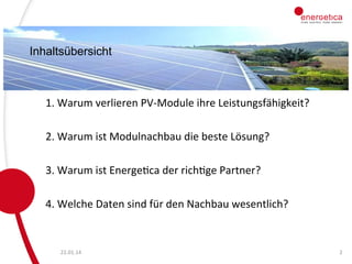Das Dokument behandelt die Probleme und Ursachen von Schäden an Photovoltaikmodulen sowie die Vorteile des Modulnachbaus als Lösung. Energetica Energietechnik GmbH wird als geeigneter Partner für den Nachbau vorgestellt, da sie über umfangreiche Erfahrung und Qualität verfügt. Wichtige Daten für den Nachbau umfassen technische Spezifikationen und Typen der betroffenen Module.