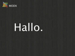 Das Dokument behandelt das Content Management System (CMS) MODX, das 2005 als Fork von Etomite entstand und insbesondere für seine Flexibilität bekannt ist. Es bietet eine benutzerfreundliche und modern gestaltete Plattform mit Funktionen wie umfassendem Caching und Unterstützung für mehrere Domains. Zudem werden Beispiele für die Nutzung von Snippets und Template-Variablen zur Dynamisierung von Inhalten gegeben.