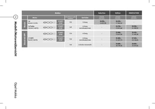 Das Dokument enthält Informationen zu Preisen, Ausstattungen und technischen Daten des Opel Mokka, einschließlich verschiedener Motorisierungen, CO2-Emissionen und Ausstattungspaketen. Es sind unter anderem Details zu Sicherheitsmerkmalen, Komfortausstattungen und Infotainmentsystemen aufgeführt. Die Tabelle enthält auch Preisinformationen sowohl mit als auch ohne Mehrwertsteuer sowie spezielle Angebote für gewerbliche Kunden.