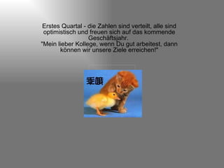 Das Dokument beschreibt den Verlauf eines Geschäftsjahres in vier Quartalen, beginnend mit Optimismus und Zielverwirklichung, gefolgt von sinkender Leistung und steigendem Druck der Geschäftsleitung. Im dritten Quartal wird der Rückstand deutlich, und der Druck auf die Mitarbeiter steigt erheblich. Im vierten Quartal herrscht eine angespannte Situation, wobei die Aufforderungen zur harten Arbeit immer dringlicher werden.