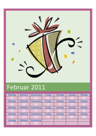 Das Dokument beschreibt den Kalender für das Jahr 2011, aufgeteilt in Monatsansichten für jeden Monat von Januar bis Dezember. Die Wochen sind in Wochentagen angeordnet, ohne spezifische Ereignisse oder Feiertage zu beschreiben. Es wird darauf hingewiesen, dass es Übungen zu Microsoft Office 2010 von Ingrid von Koslowski gibt.