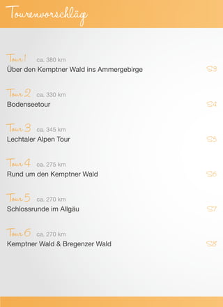 Das Dokument enthält ein Roadbook mit verschiedenen Tourenvorschlägen rund um das Gästehaus Bergblick im Allgäu, wobei insgesamt sechs Haupttouren mit unterschiedlichen Längen von ca. 270 km bis 380 km beschrieben werden. Die Routen führen durch malerische Landschaften wie den Kemptner Wald, das Ammergebirge und die Lechtaler Alpen. Zusätzlich sind Informationen über die Kartenbasis und Gestaltung des Dokuments enthalten.