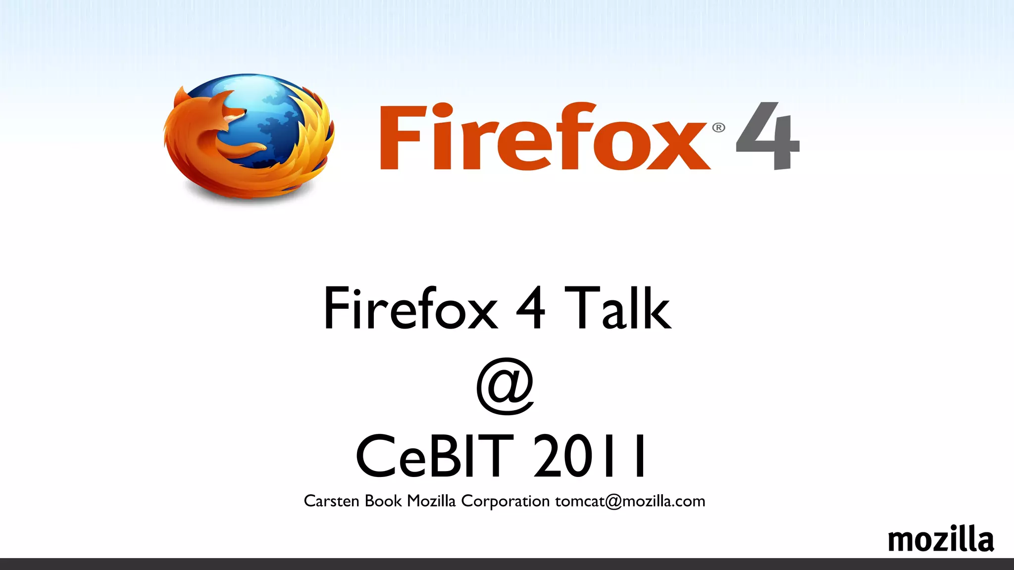 Firefox 4, vorgestellt auf der CeBIT 2011, bietet eine erheblich verbesserte Geschwindigkeits- und Sicherheitsarchitektur, die Surfen effektiver macht. Der Browser unterstützt wichtige Webstandards wie HTML5 und wird für verschiedene Betriebssysteme in über 70 Sprachen verfügbar sein. Mit neuen Funktionen wie dem Firefox-Menübutton, verbesserten Tabs und Firefox Sync zur Synchronisation von Daten zwischen Geräten legt Firefox 4 großen Wert auf Benutzerfreundlichkeit und Interaktivität.