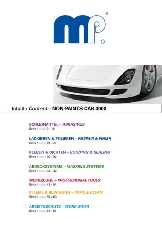 Das Dokument beschreibt eine Produktreihe von Schleifmitteln und Zubehör für Autos, einschließlich technischer Daten, Anwendungsbereiche und Artikelnummern. Es hebt die Vorteile von Premium-Schleifscheiben und anderen abrasiven Produkten hervor, die eine höhere Standzeit und flexibles Design bieten. Die Produkte sind für verschiedene Schleif- und Polieranwendungen ausgelegt und beinhalten Informationen über Zubehör und Werkzeuge.