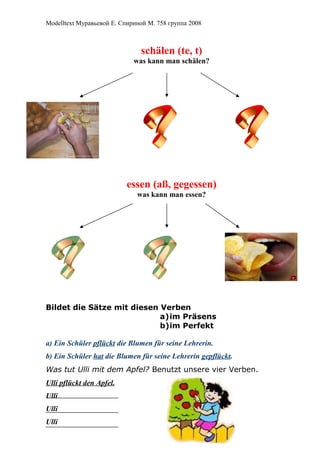 Das Dokument ist ein Lehrmaterial für den Deutschunterricht, das sich auf die Verwendung von Verben im Passiv und Aktiv konzentriert. Es enthält Übungen zur Vervollständigung von Sätzen, Aktionsverben sowie deren Rekonstruktion und umformulierung. Zusätzlich wird kreatives Schreiben gefördert, indem die Lernenden eigene Texte zu verschiedenen Themen verfassen sollen.