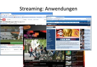 Das Dokument behandelt die verschiedenen Aspekte des Video-Streamings, einschließlich der Prinzipien, Technologien und Formate wie Unicast, Multicast und Broadcast. Es erläutert die technischen Komponenten des Streaming-Prozesses, nennt Beispiele für Streaming-Server und -Protokolle und beschreibt die Integration von Streaming in Heimnetzwerke durch DLNA und UPnP. Außerdem werden zukünftige Trends wie Web-TV, personalisierte Streams und die Konvergenz von Medien angesprochen.