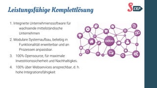 Das Dokument beschreibt eine integrierte ERP-Lösung für mittelständische Unternehmen, die multichannel E-Commerce unterstützt und vollständig Open Source ist. Es bietet modulare Funktionen für Vertrieb, Einkauf, Warenwirtschaft und Buchhaltung, die über Webservices ansprechbar sind und eine hohe Effizienz und Benutzerfreundlichkeit gewährleisten. Zudem werden Kundenportale und Schulungen für Mitarbeiter angeboten, um den Implementierungsprozess zu erleichtern.