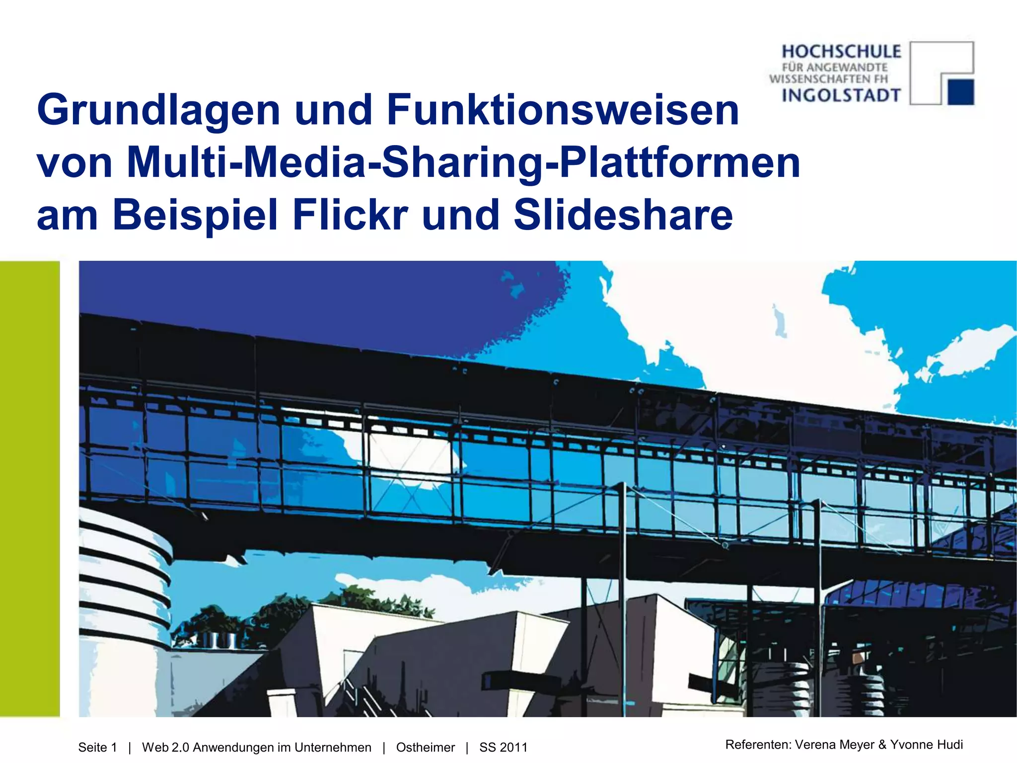 Die Präsentation behandelt die Grundlagen und Funktionsweisen von Multimedia-Sharing-Plattformen wie Flickr und SlideShare, einschließlich ihrer Anwendung in Unternehmen und der Herausforderungen im Hinblick auf Urheberrecht. Ihre Nutzung ermöglicht einen effektiven Austausch von Medien und die Organisation von Inhalten, birgt jedoch auch Risiken, wie die Verletzung geistigen Eigentums. Die Referenten, Verena Meyer und Yvonne Hudi, beleuchten sowohl die Chancen als auch die Risiken dieser Plattformen.