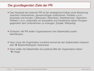 Das Dokument behandelt die grundlegenden Ziele der Öffentlichkeitsarbeit (PR), insbesondere den strategischen Aufbau von Beziehungen zwischen Organisationen und ihren Stakeholdern, um ein positives Image zu fördern. Es wird die Bedeutung klassischer Medien sowie die zunehmend dominierende Rolle von Konsumenten und digitalen Plattformen als neue Multiplikatoren und Meinungsführer hervorgehoben. Online-PR unterscheidet sich durch höhere Interaktivität, weniger Kontrolle und einen schnelleren Informationsfluss.