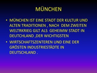 München ist eine bedeutende Kulturstadt in Deutschland, die für ihre alten Traditionen und wirtschaftliche Stärke bekannt ist. Der Olympiapark, der für die Olympischen Sommerspiele 1972 erbaut wurde, dient heute als Veranstaltungsort für verschiedene kulturelle Events, während das Oktoberfest, als weltgrößte Fachmesse, jährlich Millionen von Besuchern anzieht. Die Glyptothek und die BMW Welt sind weitere bedeutende kulturelle und touristische Attraktionen der Stadt.