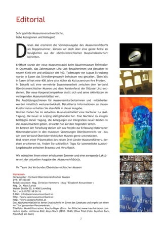 Das Museumsinfoblatt berichtet über die Neueröffnungen und Umgestaltungen verschiedener Museen in Oberösterreich, darunter der neue Museumsstadl im Bauernmuseum Reinhalte und die Neugestaltung des Strindbergmuseums. Zudem werden neue Ausbildungsangebote für Museumsmitarbeiter und ein Projekt zur Erfassung historischer Notenmaterialien vorgestellt. Abschließend gibt es Hinweise auf aktuelle Ausstellungen und Veranstaltungen und einen Ausblick auf Sommeraktivitäten in den Museen.