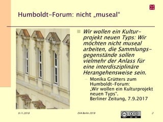 Das Humboldt-Forum strebt an, ein neues Kulturprojekt zu sein, das interdisziplinäre Ansätze für die Präsentation von Sammlungsgegenständen nutzt, anstatt auf eine museale Darstellung zu setzen. Die digitale Transformation des Kulturguts in Deutschland steht noch am Anfang, mit Fokus auf digitale Repräsentationen, aber fehlender maschinell unterstützter Analyse und semantischer Verknüpfung. Die Herausforderungen der Digitalisierung betreffen sowohl die Strukturierung als auch die Verfügbarkeit von Daten, die oft nicht nach modernen Standards erschlossen sind.