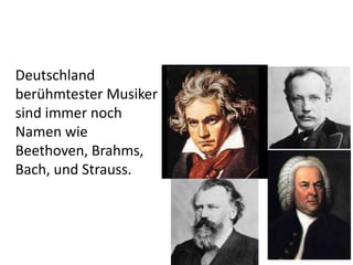 Deutschland hat eine reiche Musiktradition mit berühmten Komponisten wie Beethoven und Bach sowie einer blühenden zeitgenössischen Musikszene, die durch Künstler wie Herbert Grönemeyer und Bands wie Rammstein geprägt ist. Das Land beherbergt 80 öffentlich finanzierte Musiktheater und zieht weltweit Studenten und Musikliebhaber an, während die Gründung der Popakademie in Mannheim den Fokus auf die Wettbewerbsfähigkeit deutscher Popmusik legt. Die Clubszene, insbesondere in Städten wie Berlin und Köln, bietet zahlreiche angesagte Locations und hat DJs zu wichtigen Künstlern der Musiklandschaft gemacht.