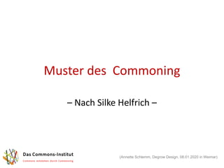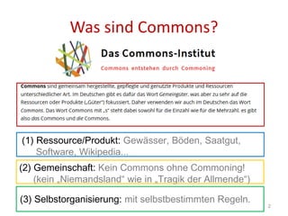 Das Dokument thematisiert Commons als lebendige soziale Strukturen, in denen Menschen ihre gemeinsamen Probleme selbstorganisiert angehen, und verweist auf die Bedeutung von Mustern im Commoning. Es werden verschiedene Muster und Prinzipien für erfolgreiches Commoning erörtert, einschließlich der Notwendigkeit zu kooperativer Selbstorganisation und der Abgrenzung von kommerziellen Interessen. In praxisorientierten Beispielen wird gezeigt, wie solche Muster zur Lösung spezifischer Probleme, wie der fairen Zuteilung von Ressourcen, angewendet werden können.