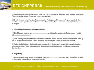 Das Dokument legt die allgemeinen Bedingungen eines freien Mitarbeitervertrags zwischen einem Auftraggeber und einem Auftragnehmer fest, einschließlich der Vereinbarung zu Tätigkeitsumfang, Vergütung, Kündigungsfristen und Urheberrechten. Der freie Mitarbeiter hat die Freiheit, seinen Arbeitsplatz und seine Arbeitszeiten selbst zu bestimmen und verpflichtet sich zur Vertraulichkeit bezüglich Geschäftsgeheimnissen. Eine schriftliche Änderung des Vertrags bedarf der Zustimmung beider Parteien und jegliche gesetzliche Regelungen bleiben unberührt.