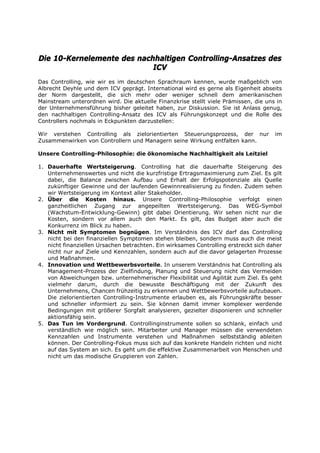Der nachhaltige Controlling-Ansatz des ICV betont die ökonomische Nachhaltigkeit als zentrales Ziel und die Verantwortung der Controller in der Unternehmensführung. Controller fungieren als aktive Partner des Managements, die nicht nur finanziellen Daten analysieren, sondern auch Markt- und Prozessverständnis einbringen, um Innovation und Wettbewerbsvorteile zu fördern. Der Ansatz fordert eine ganzheitliche Sicht auf Wertsteigerung, die über bloße Kostenerfassung hinausgeht und die Entwicklung nachhaltiger Unternehmensstrategien in den Fokus rückt.