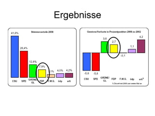 Bei der Kommunalwahl 2008 erreichte die bürgerliche Mehrheit in Erlangen mit CSU, FDP und OB-Stimme insgesamt 26 Sitze, was eine Mehrheit bei 25 Sitzen darstellt. Dr. Elisabeth Preuß wurde zur Bürgermeisterin gewählt und das Programm der FDP wurde in verschiedenen Foren diskutiert. Die FDP betont ihre Rolle als treibende Kraft innerhalb der bürgerlichen Mehrheit und kündigt Engagement in mehreren Themenbereichen an.
