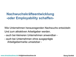 Das Dokument behandelt die Entwicklung von Nachwuchskräften und deren Beschäftigungsfähigkeit (Employability) aus Unternehmenssicht, wobei auch kleinere Firmen ohne starke Arbeitgebermarke einbezogen werden. Employability wird als entscheidender Faktor für die Rekrutierung und Bindung junger Talente betrachtet, wobei zwischen tatsächlicher und hypothetischer Employability unterschieden wird. Die Erstellung effektiver Programme zur Nachwuchskräfteentwicklung erfordert organisatorische Ressourcen, Zeit und Integration in bestehende Managementsysteme.